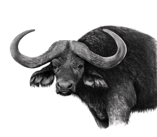 The proud features of this buffalo are accentuated against a stark background, highlighting its unmistakable silhouette, while beautiful details and texture bring out the character of the animal’s face. Although the buffalo is one of Africa’s most feared animals, the artist has captured a tender look in the animal’s eyes, evocative of both vulnerability and strength.