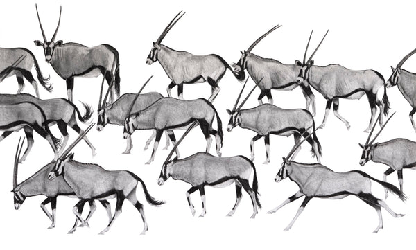 The gemsbok’s contrasting markings and long horns create a striking repetitive pattern as the herd is depicted moving across a flat, white setting. The image exudes a tranquil atmosphere with a subtle surreal element alluding to a dream state. Its monochrome simplicity, uniform dimensions and clean lines are enriched with the individual poses and portraits of the animals.