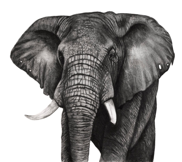 The African elephant is beautifully represented in this black and white portrait. Rendered with fine detail and texture, its magnificent head is highlighted against a white backdrop. The image is simple in its composition yet rich in its emotive depth which is evident in the sensitive handling of the subject.