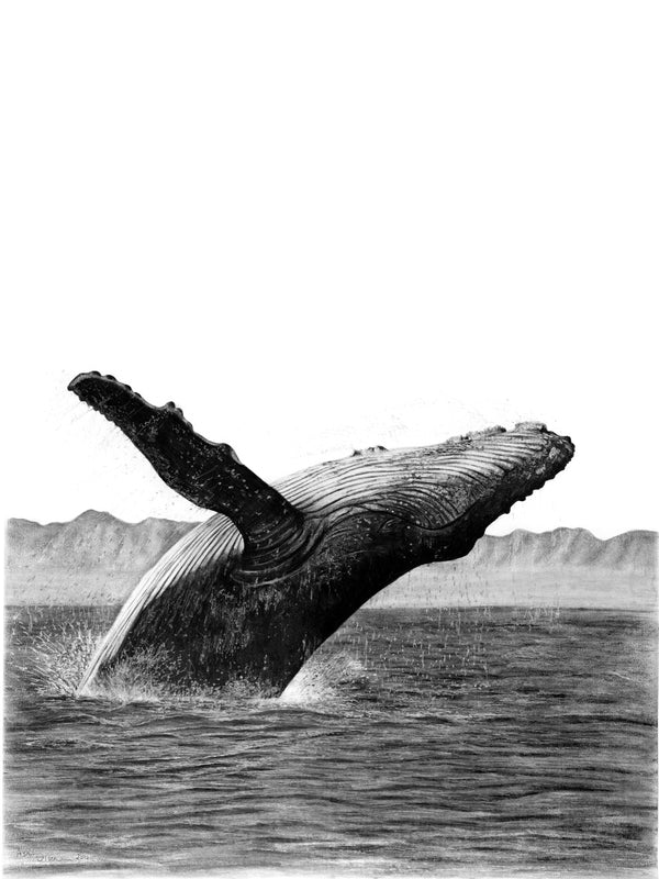 In this portrait of a humpback whale breaching, the dark form of the whale’s body is highlighted against a simple background. The whale is depicted in fine detail, with even the barnacles on its head being visible as well as the various textures of its skin. Water is descriptively portrayed flying off the whale as it propels its large body upwards. Rich texture and detail are combined with simple lines and open spaces, creating a beautiful, ocean-inspired contemporary image. As part of a series of whale drawings, the artwork looks impressive hanging as a large individual piece, or collectively as smaller prints.