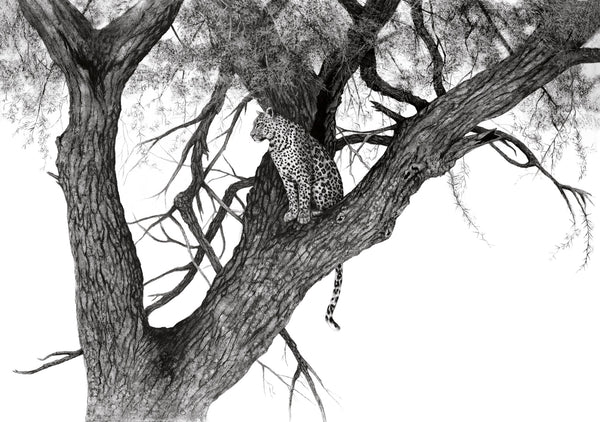 Both the leopard and acacia tree are descriptively rendered with a delicate and decisive style; it is an artwork that adds intrigue and narrative to any chosen interior.