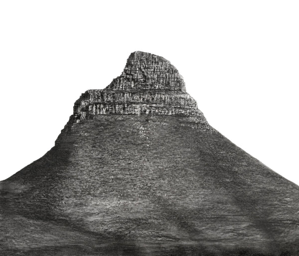 The majestic Lion’s Head is brought to life in this large scale charcoal drawing. Sitting proud, rocky and ruin-like, the stately mountaintop is beautifully highlighted against a crisp, clear background. With deep contrasting tones, the chalky white-grey of the protruding rocks stand out against the deep, shadowed crevices.