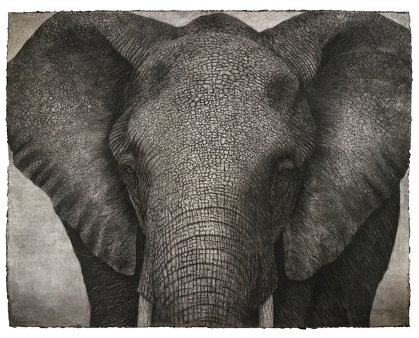 Matriarch is an intricately detailed charcoal portrait of a large female elephant, whose noble head fills the entire artwork. Her wrinkled hide is depicted with beautiful texture; crusty dried mud adorns her thick folded hide and the image radiates an ancient presence.