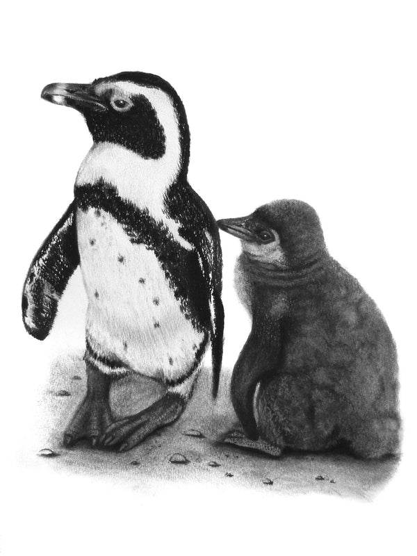 This is a portrait of an African penguin and its young chick, descriptively rendered as a charcoal drawing. When the chicks hatch they are covered in a soft, charcoal grey, downy fluff and are totally dependent on their parents. They produce a whistling ‘peep’ and hissing sound to demand food from mom and dad, who will look after their young until they are fully fledged and can enter the sea by themselves.