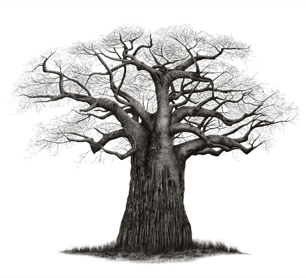 In this powerful portrait of an African baobab, the organic, dark tones of the charcoal medium are contrasted against a classic white background, creating an image that is both descriptive yet minimalist in design. The ancient tree is depicted with opulent texture and detail which beautifully portrays its age and worn character.